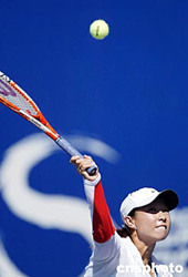 九月十八日,在北京網(wǎng)球中心中央球場進行的ITF女子單打決賽中,中國選手鄭潔以二比零戰(zhàn)勝隊友李娜奪得冠軍。圖為鄭潔在比賽中。中新社記者:盛佳鵬