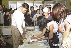 九月十九日在東京鐵路客站大廳舉行的“二零零八相約奧運揚帆青島”推介展示活動,吸引了眾多日本民眾。他們在展臺前排起長隊索取資料,并在一塊象征奧運帆船賽揚帆青島的白色帆布上簽名,表示關注和支持。作者:王健