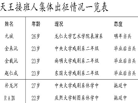 正當宋承憲、張赫、韓在石“非法逃兵役”事件受到各界關注時,還沒當兵的天王接班人元斌、金來沅、金載沅、趙仁成、RAIN即將面臨同樣的問題,可以想像的是,他們會記取前車之鑒而不敢造次。韓國男星沒當兵的人實在太多,許多小天王為了自己大好演藝事業(yè),不敢面對現(xiàn)實,一再以休學來拖延當兵,年紀都二十郎當了,還在念大一、大二,不然就像樸龍河一樣到了27歲還沒畢業(yè)去當兵。