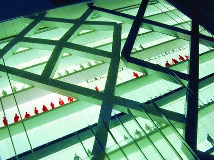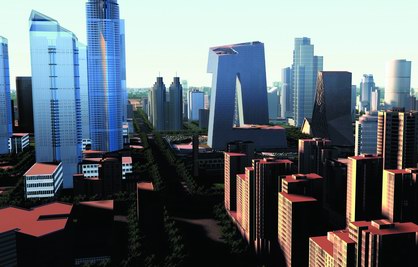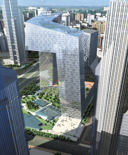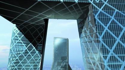 CCTV主樓的兩個塔樓從一個共同的平臺升起,在上部匯合,形成三維體驗,突破了摩天樓常規(guī)的豎向特征的表現(xiàn)。復雜的功能包容在內部緊密連接的環(huán)路中,體現(xiàn)一個相互合作、相互依存的鏈條以及自身組織的有序和協(xié)調。