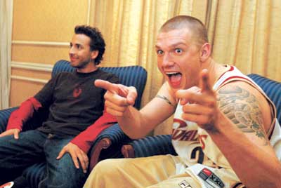 昨天,高大粗壯的Nick和瘦小精干的Howie在兩名保鏢的護(hù)衛(wèi)下出現(xiàn)在北京飯店。跟剛下飛機(jī)的時(shí)候不一樣,Howie換成了一身短打扮,而高大的Nick則穿著一件籃球背心、運(yùn)動(dòng)褲,儼然一位美國NBA的灌籃高手。不過,他的寬大裸露的肩上大片的刺青引起了記者們的注意,特別是圖案中間刺著的兩個(gè)漢字——“海神”。跟莊重嚴(yán)肅的保鏢顯然不同,他們對媒體記者絲毫沒有敵意,面對鏡頭非常配合地做著各種幽默甚至滑稽的動(dòng)作和表情。