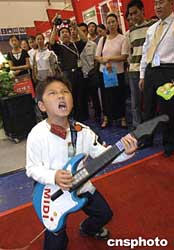 九月二十三日,一位彈吉它的搖滾小朋友在青島會展中心為在這里舉行的2004青島國際時(shí)裝周助興。作者:史利