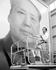 按照慣例,每年國慶節(jié)前,天安門城樓的毛澤東主席畫像都要更換,今年也不例外。自1977年就一直擔(dān)負(fù)畫主席像工作的畫家葛小光已在畫室半個(gè)多月,目前這幅長6米、寬5米的油畫已近尾聲。葛小光說,由于主席像掛在戶外,經(jīng)受風(fēng)吹日曬,所以這幅油畫的顏色和造型需要技巧,盡量減少季節(jié)、光照等因素的影響,掛上去后無論從哪個(gè)角度看都不會(huì)有太大變化。如果天氣沒有變化,27日晚將掛上城樓。