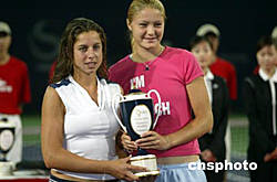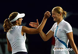 薩芬娜與加格里亞蒂互慶女雙決賽獲勝九月二十六日,中國(guó)網(wǎng)球公開(kāi)賽女子雙打決賽在北京網(wǎng)球中心中央球場(chǎng)進(jìn)行,俄羅斯選手薩芬娜與瑞士選手加格里亞蒂組合戰(zhàn)勝阿根廷選手杜爾科與委內(nèi)瑞拉選手卡比奇組合,摘得桂冠。中新社記者:武仲林