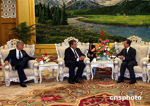 溫家寶表示,當(dāng)前中美關(guān)系總的發(fā)展勢(shì)頭是好的,經(jīng)貿(mào)合作不斷向前發(fā)展。去年我訪(fǎng)美時(shí)與布什總統(tǒng)就處理兩國(guó)經(jīng)貿(mào)問(wèn)題達(dá)成五點(diǎn)共識(shí),其核心就是“發(fā)展、平等、互利”。希望雙方本著上述精神,維護(hù)中美經(jīng)貿(mào)關(guān)系的健康穩(wěn)定發(fā)展。