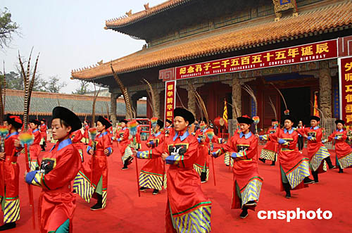在祭祀孔子大典儀式上,曲阜當(dāng)?shù)匮輪T在大成殿前表演了大型祭孔樂(lè)舞。作者:鞠成利
