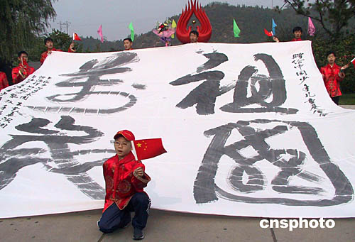 在中華人民共和國成立五十五周年到來之際,一位名叫陳鼎新的上海十歲學(xué)童(前),九月二十九日在北京八達(dá)嶺長城把自己書寫的一幅巨筆書法作品捐獻(xiàn)給“中國少年兒童基金會”,以表達(dá)對祖國的祝福。作者:宗金柱