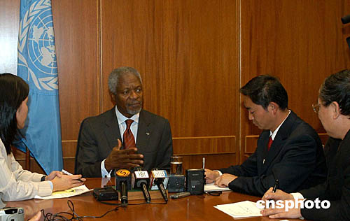 中新網(wǎng)聯(lián)合國10月6日電(記者 陳建)聯(lián)合國秘書長安南有望今秋訪華。美東時(shí)間十月六日下午,他在紐約聯(lián)合國總部接受了中國記者的聯(lián)合采訪。安南說,在他的日程表上,有三件事最緊要:法治、改革、發(fā)展。