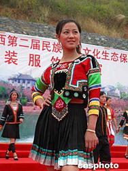 湖南省民族民間文化藝術(shù)博覽會暨湘西第二屆民族民間文化生態(tài)保護(hù)藝術(shù)節(jié)于十月四日至七日在湘西舉行。在鳳凰南長城,三十名大學(xué)生模特身著土家族、苗族、白族、侗族等八大少數(shù)民族的服裝服飾,穿插民族歌舞全面展示了少數(shù)民族濃郁的服飾文化。圖為選手在向游客展示侗族服飾。作者:劉雙雙