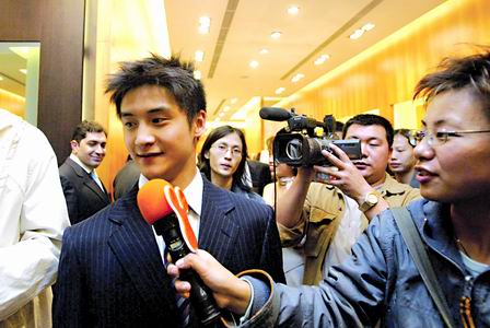 當(dāng)“跳水王子”身著筆挺的意大利西裝走到簽到臺(tái)前時(shí),記者們瘋了似地沖將過(guò)去,電視臺(tái)的編導(dǎo)激動(dòng)地將話筒伸到田亮嘴邊,讓他說(shuō)說(shuō)郭晶晶,談?wù)劯凵。雙眼略顯紅腫的田亮在經(jīng)紀(jì)人的保護(hù)下低頭讓過(guò),對(duì)任何問(wèn)題不予應(yīng)答。經(jīng)紀(jì)人劉先生稱,田亮剛剛從美國(guó)乘坐了34個(gè)小時(shí)的飛機(jī)到達(dá)北京,其間轉(zhuǎn)乘了4個(gè)航班,非常勞累,因此不便接受采訪。(記者 胡雪柏王錚)
