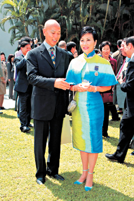 獲頒星章后,“阿姐”在家英陪同下,步進禮賓府的草地參與酒會,期間家英充當攝影師,不停為“阿姐”與其它嘉賓拍照留念。雖然記者起哄要他親“阿姐”以示道賀,但卻食了“阿姐”的檸檬。