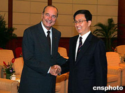 中新社上海十月十一日電 (記者陳靜)中共中央政治局委員、上海市委書記陳良宇,市委副書記、市長韓正今天在此間會見并宴請了正在上海訪問的法國總統(tǒng)希拉克。陳良宇表示,相信此訪將進一步增進上海人民對法國的了解與友誼,續(xù)寫上海與法國之間友好合作新篇章。
