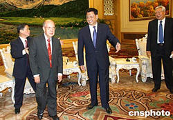 十月十二日在北京人民大會堂,全國政協(xié)常務(wù)副主席王忠禹(右二)、全國政協(xié)副主席羅豪才(右一)會見出席《紀(jì)念陳嘉庚先生誕辰130周年座談會》的陳嘉庚先生七子陳元濟(jì)等親屬。