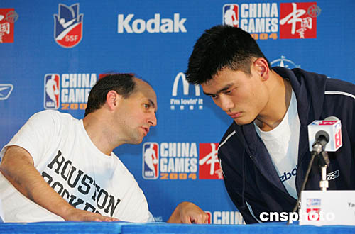 圖為在新聞發(fā)布會上,范甘迪不時與姚明“竊竊私語”進(jìn)行交流。