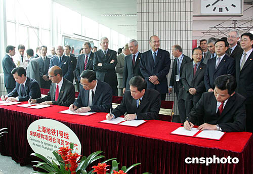 十月十二日,法國總統(tǒng)希拉克參觀、乘坐上海軌道交通三號線,并見證“上海地鐵一號線車輛續(xù)購項目合同簽字儀式”。上海申通集團(tuán)有限公司將購置一百二十八輛中法合作生產(chǎn)的地鐵車輛,二十二個月后這些車輛將陸續(xù)投入營運。作者:潘索菲