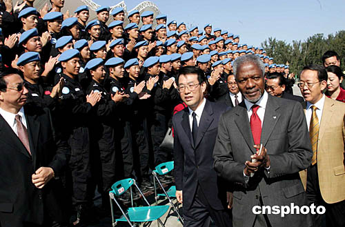 正在北京訪問(wèn)的聯(lián)合國(guó)秘書長(zhǎng)安南,十月十二日參觀公安部維和中心。中新社記者:毛建軍
