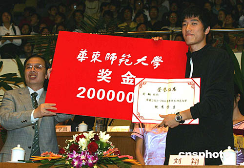| 雅典奧運(yùn)會(huì)男子一百一十米欄冠軍劉翔(右),十月十三日被上海華東師范大學(xué)授予“優(yōu)秀學(xué)生”稱(chēng)號(hào),并被推薦免試直接升入該校研究生,且碩士、博士連讀,同時(shí)獲得人民幣二十萬(wàn)元獎(jiǎng)勵(lì)。劉翔現(xiàn)為該校四年級(jí)學(xué)生。圖為該校校長(zhǎng)王建磐向劉翔頒獎(jiǎng)。作者:潘索菲