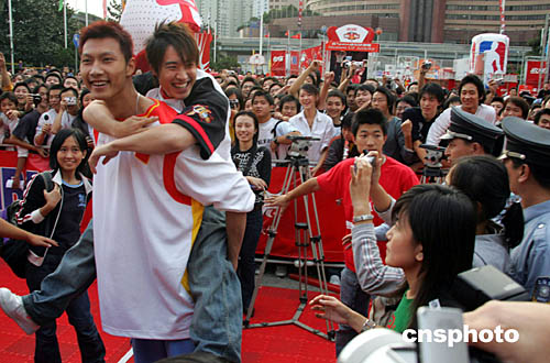 NBA中國大賽十月十四日即將在上海體育館舉行。十三日舉行的“可口可樂NBA嘉年華”出現(xiàn)火爆追星情形?煽诳蓸沸蜗蟠匀伺爽|柏一見中國男籃隊球員易健聯(lián)便跳躍在其背上,引起上海追星族歡呼和現(xiàn)場混亂。作者:潘索菲