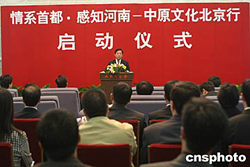 十月十四日,由河南省主辦的“情系首都.感知河南--中原文化北京行”啟動(dòng)儀式在北京人民大會(huì)堂舉行。首次來京舉辦的一系列大型文化交流和宣傳活動(dòng),將展示河南悠久的歷史、美麗的河山、燦爛的文化以及改革開放的成就。圖為河南省委副書記王全書在介紹河南情況。中新社記者:史利