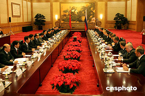 普京完全贊同胡錦濤的看法和建議,他說,發(fā)展俄中合作是俄一貫政策!抖碇心类徲押煤献鳁l約》為兩國關(guān)系發(fā)展奠定了重要基礎(chǔ),雙方解決邊境問題、就俄加入世貿(mào)組織達(dá)成協(xié)議是兩國戰(zhàn)略協(xié)作伙伴關(guān)系的體現(xiàn)。我們愿與中方切實落實該條約的實施綱要,推動雙方在各領(lǐng)域的合作。俄方希望加強(qiáng)經(jīng)貿(mào)合作,爭取在數(shù)量和質(zhì)量上均不斷提高。他重申,俄方關(guān)于同中國的能源合作的決定始終未變,也愿同中國加強(qiáng)在科技、人文等領(lǐng)域的合作。