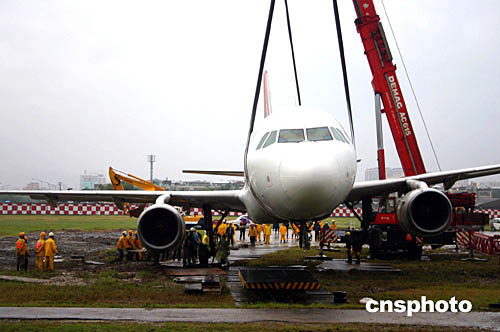 此間電視臺(tái)報(bào)道,這架載有九十人的A-320飛機(jī)原計(jì)劃晚八點(diǎn)在松山機(jī)場(chǎng)降落,由于天雨跑道濕滑,加上側(cè)風(fēng),出現(xiàn)失控,險(xiǎn)些撞到機(jī)場(chǎng)圍墻。駕駛員緊急左轉(zhuǎn),因而飛機(jī)沖出跑道。從電視畫面上看,飛機(jī)前輪似有損壞,機(jī)頭微朝下。
