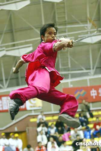 在男子劍術(shù)的比賽中,精彩場(chǎng)面不斷,圖為一名參賽選手在比賽中凌空攻擊,如同小說中的俠客。中新社記者:盛佳鵬