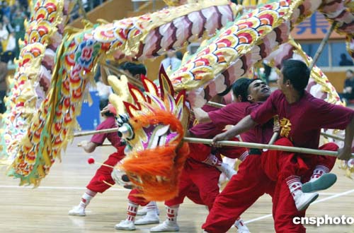 在舞龍比賽自選套路的比賽中,貴州隊(duì)表演了高難度舞龍動(dòng)作。中新社記者:盛佳鵬