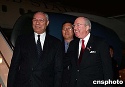 美國國務卿鮑威爾十月二十四日傍晚乘專機抵達北京,開始訪華行程。中新社記者:毛建軍