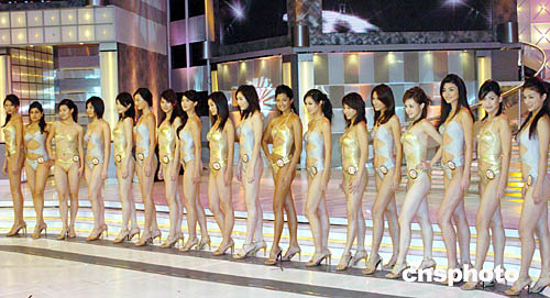 2004亞洲小姐競選總決賽十月二十四日晚在香港演藝學(xué)院舉行,來自各國的十八位參賽佳麗爭奪是次大賽桂冠。圖為參賽佳麗身穿泳裝展示風(fēng)采。中新社記者:錢興強
