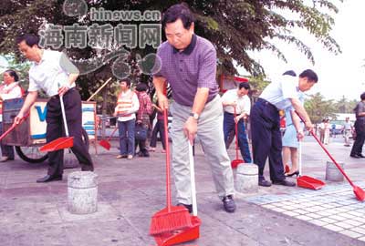 南國都市報(bào)報(bào)道,26日上午8點(diǎn)50分,海南省委副書記、省長衛(wèi)留成在海口海秀東路明珠廣場前,拿著掃把和簸箕,順著路面一直往東清掃過去,碰到粘在路面上的紙片、桔子皮,就蹲下身去把它們摳出來。