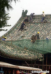 十月二十九日,京城皇家祭壇——地壇啟動有史以來規(guī)模最大、最完整的一次古建筑文物修繕工程。整個工程修繕面積達(dá)一萬九千八百平米,耗資四百余萬元人民幣,預(yù)計于二零零六年夏天完工。圖為建筑工人們在宰牲亭的屋頂局部進(jìn)行修整。作者:韓藝冰