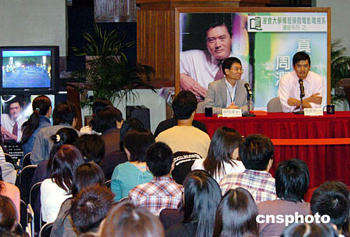三時(shí)半,周潤(rùn)發(fā)在妻子陳薈蓮陪同下進(jìn)場(chǎng),學(xué)生們歡呼與拍手聲不絕,氣氛猶如一個(gè)影迷聚會(huì)。座談會(huì)開始前,大會(huì)安排三分鐘予傳媒攝影,數(shù)十名中外記者及大量學(xué)生涌到臺(tái)前拍攝周潤(rùn)發(fā)的肖像,連周也不禁說(shuō):“現(xiàn)在像記者招待會(huì)多過座談會(huì);似影迷聚會(huì)多過座談會(huì)!”