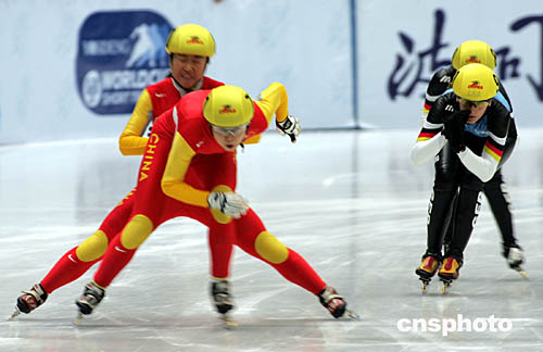 中國(guó)隊(duì)(左)在北京舉行的2004/2005波司登國(guó)際滑聯(lián)短道速滑世界杯女子3000米接力賽半決賽中發(fā)揮出色,奪得小組第一。