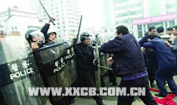 20余人聚集在某市市政府前“鬧事”,110民警迅速趕到現(xiàn)場設立警戒線,阻止“鬧事者”的前進。但情緒激動的“鬧事者”很快便沖破了第一道防線,開始毆打民警。接報趕到的防暴大隊特警手持防暴盾牌進行攔截,設置了第二道防線。為了迅速平息大規(guī)模的“騷亂事件”,上級命令使用催淚彈等對“鬧事人群”進行驅散。幾顆催淚彈丟在地上,散出滾滾濃煙。當特警采取防暴隊形圍捕了為首的“鬧事者”后,其余人便立即作鳥獸散去,“危機”終于化解。