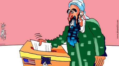 中新網(wǎng)11月1日電 10月29日晚,銷聲匿跡一年多的本拉登,在美國大選投票日來臨的前四天突然拋頭露面了。在半島電視臺播放了本拉登講話的錄像帶之后,分析家一致認(rèn)為拉登此次露面是為了給美國大選施加影響,試圖影響美國大選的最終結(jié)果。半島電視臺網(wǎng)站于今日發(fā)表了一幅漫畫,在這幅漫畫當(dāng)中,本拉登被描繪成一個(gè)重量級選民,他的講話被戲稱作是在為美國總統(tǒng)大選提前投票。(章田)