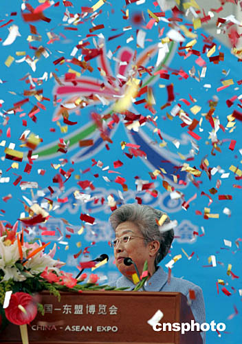 圖為中國(guó)國(guó)務(wù)院副總理吳儀宣布南博會(huì)開幕。