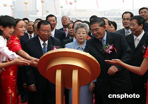 圖為中國(guó)國(guó)務(wù)院副總理吳儀、柬埔寨首相洪森和老撾總理本揚(yáng)等,在開幕式上共同啟動(dòng)世紀(jì)時(shí)鐘。