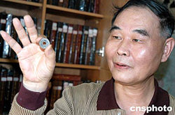 福建省收藏文化研究會(huì)名譽(yù)會(huì)長(zhǎng)、福建錢(qián)幣收藏第一人欣士敏,十一月十日在福州首次向外界展示一枚清康熙二十七年(公元一六八八年)臺(tái)灣錢(qián)局鑄造發(fā)行的珍稀錢(qián)幣。這枚背面寫(xiě)有滿(mǎn)、漢文“臺(tái)”字字樣的“康熙通寶”錢(qián)幣是三百多年前清政府統(tǒng)一臺(tái)灣、設(shè)置臺(tái)灣府的歷史見(jiàn)證。作者:劉可耕