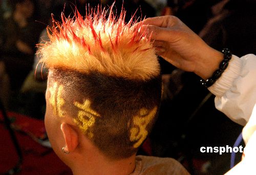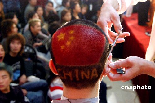 一位美發(fā)師在為參賽選手精心修剪,涵蓋了中國國旗圖案、“CHINA”和“2008”字母在參賽選手頭上。