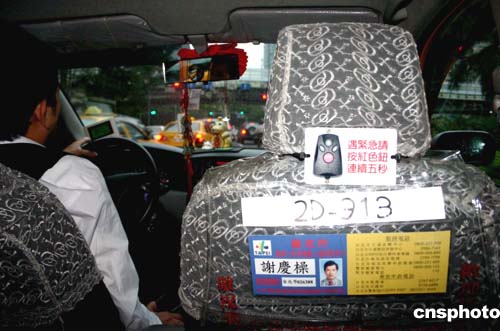 | “臺(tái)北衛(wèi)星車隊(duì)”所屬的計(jì)程車近日為后排車座乘客安裝衛(wèi)星SOS,乘客遇到緊急危險(xiǎn)情況時(shí)啟用該裝置,信號(hào)會(huì)直傳車隊(duì)中心。據(jù)知,目前臺(tái)北市安裝這種呼叫器的計(jì)程車只有百余輛,在島內(nèi)屬新鮮事。作者:董會(huì)峰