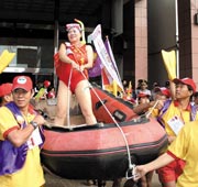 17日“立委”選舉候選人抽號次,為能上媒體鏡頭,候選人奇招盡出。桃園縣一“立委”候選人(中)不惜犧牲色相,穿著泳裝站在橡皮艇上出場。