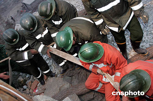 二零零四年十一月二十二日,“11.20”河北沙河礦難救援工作仍在進(jìn)行。截止當(dāng)日十九時(shí)三十分,河北沙河礦難遇難礦工人數(shù)已達(dá)五十七人,另有三人人下落不明。圖為消防戰(zhàn)士向出事礦井運(yùn)送傳輸水袋,以撲滅仍在燃燒的大火。中新社記者:武仲林