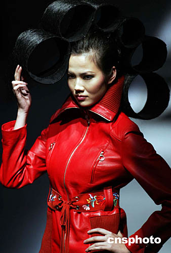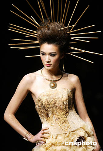 十一月二十三日,在中國國際時(shí)裝周會(huì)場北京飯店內(nèi),一場時(shí)裝發(fā)布會(huì)通過一組構(gòu)思奇特的模特造型將服裝設(shè)計(jì)師的時(shí)裝設(shè)計(jì)作品演繹得淋漓盡致,也更添模特嬌媚。中新社記者:盛佳鵬