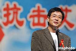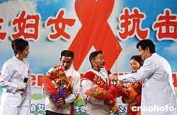 十二月一日,中國內(nèi)地演員濮存昕(右一)、蔣雯麗(左一)在“關(guān)注婦女,抗擊艾滋”活動上,與來自四川資中公民鎮(zhèn)的艾滋病毒攜帶者同臺獻(xiàn)藝,該艾滋劇團(tuán)是由四川資中縣近二十名艾滋病感染者自發(fā)組建的。作者:韓藝冰