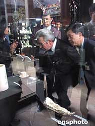 正在廣東訪問(wèn)的吉爾吉斯斯坦總理尼古拉·塔納耶夫十二月一日來(lái)到廣東民間工藝博物館(陳家祠)參觀。圖為塔納耶夫總理仔細(xì)欣賞陳家祠內(nèi)精美的象牙雕刻工藝品。作者:郭軍