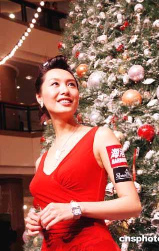 甚少露面的香港影視紅星朱茵一身紅衣打扮,出席海港城價(jià)值百萬(wàn)的圣誕樹(shù)亮燈儀式。作者:洪少葵