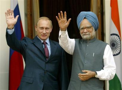 在3日普京與印度總理辛格的會晤后,雙方舉行了聯(lián)合新聞發(fā)布會。普京表示,俄羅斯將支持印度躋身聯(lián)合國安理會常任理事國行列,稱對此將不會行使一票否決權(quán);辛格則表示,印度全力支持俄羅斯加入世貿(mào)組織,稱俄為世貿(mào)148個成員國以外最大的經(jīng)濟體。