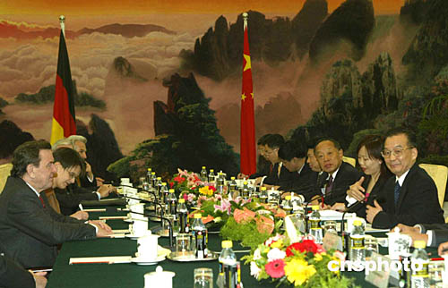 施羅德完全贊同溫家寶對德中關(guān)系的評價和建議。他說,近年來,兩國合作已達(dá)到前所未有的深度和廣度。在《德中聯(lián)合聲明》的指導(dǎo)下,雙邊政治交往密切,經(jīng)貿(mào)關(guān)系充滿活力,法制國家對話等機制進展良好,文化、教育交流頻繁。