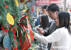 圣誕節(jié)臨近,福州市區(qū)節(jié)日氣氛漸濃。十二月六日,兩對有情人正往市區(qū)一大型商場前樹立的圣誕樹上懸掛許愿祈?,盼新年行好運。作者:劉可耕