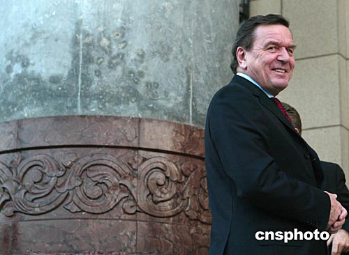 德國總理施羅德十二月七日與中國國家主席胡錦濤在北京舉行會見,活動結(jié)束后施羅德在人民大會堂外留念。中新社記者:滿會喬